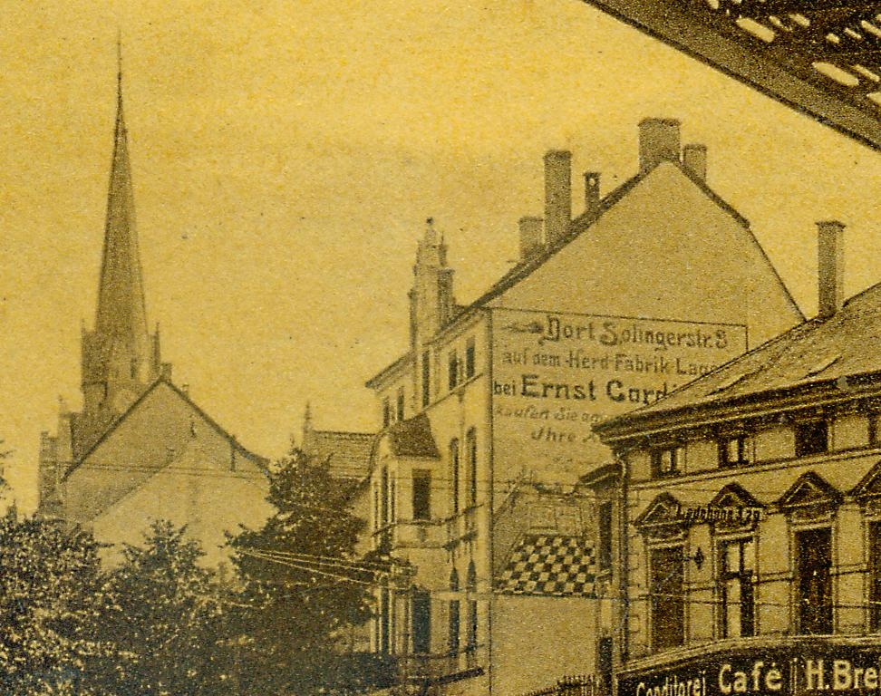 Wandreklame am Haus Solinger Str. 3 (heute Gräfrather Str.), Nähe Kaiserplatz, Vohwinkel. Von Ernst Cording 1857-1937, Altvater